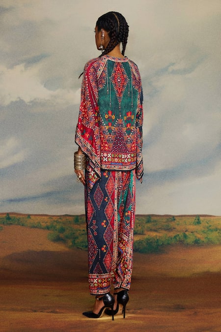 Multi Color Silk Mandarin Collar Ramona Geometric Print Poncho Top