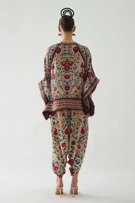 Beige Silk Embroidery Mandarin Collar Ramona Retro Blossom Print Poncho Top
