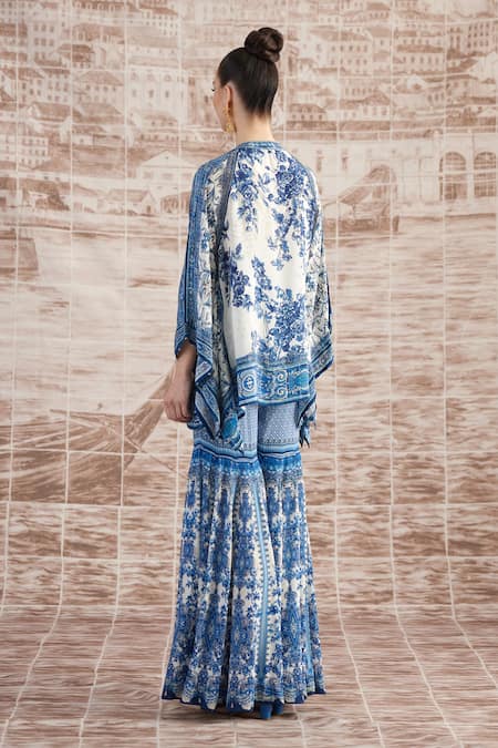 Blue poncho featuring floral digital print and mandarin collar. Paired with tiered printed sharara.