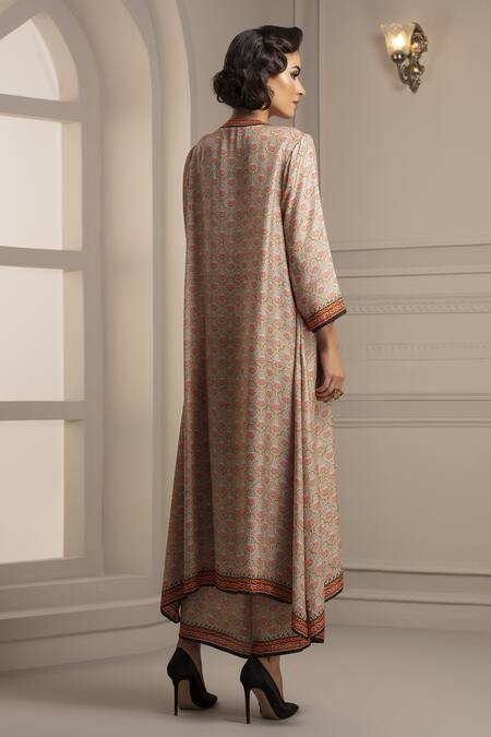 Grey long kurta with buttoned placket, uneven hem & all-over jaal motif work. Comes with printed pants & kota silk dupatta.