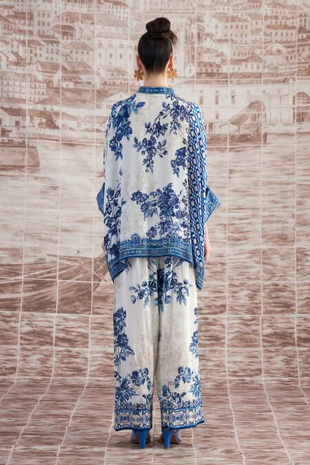 Blue floral print silk asymmetric tunic featuring a stand collar and three quarter sleeves. Paired with floral print pants for a coordinated look.