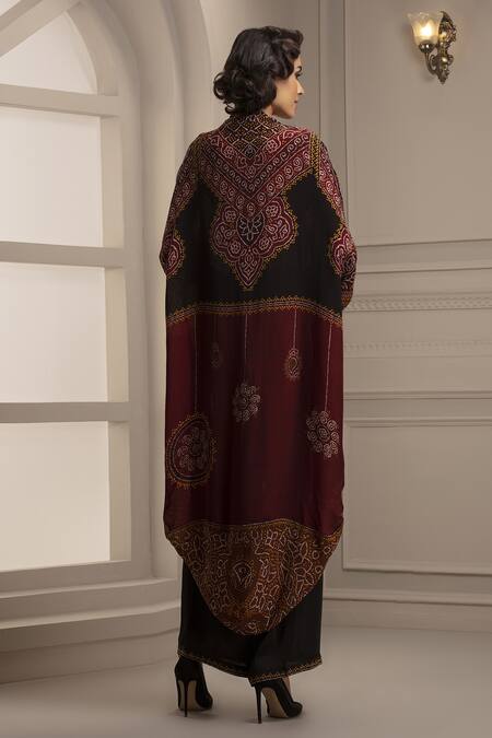 Red front-open kaftan-cape with abstract motif work & asymmetric hem. Comes with contrast pants.