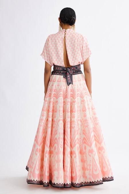 Pink lehenga featuring an abstract print with attached can-can and lining. Paired with a cowl neck blouse with back tie-up detailing and short sleeves.