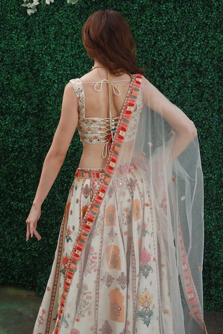 Ivory lehenga with digitally printed ,multi colored motifs & gold Kasab thread work & mirror embroidery. Paired with embroidered blouse & sheer dupatta.