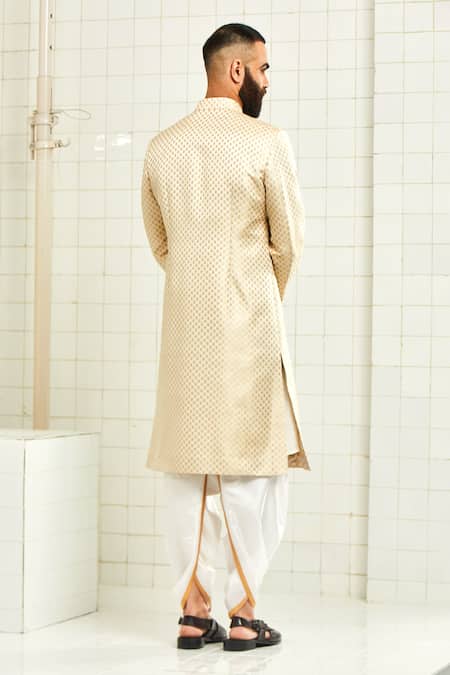Ivory sherwani with brocade motifs, front button placket & patch pocket. Comes with pocket square.