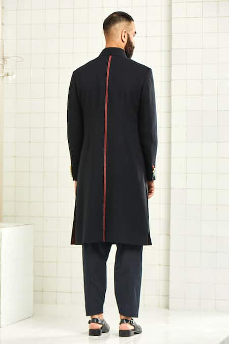 Black sherwani with cuff, front button placket & patch pocket. Comes with pocket square.