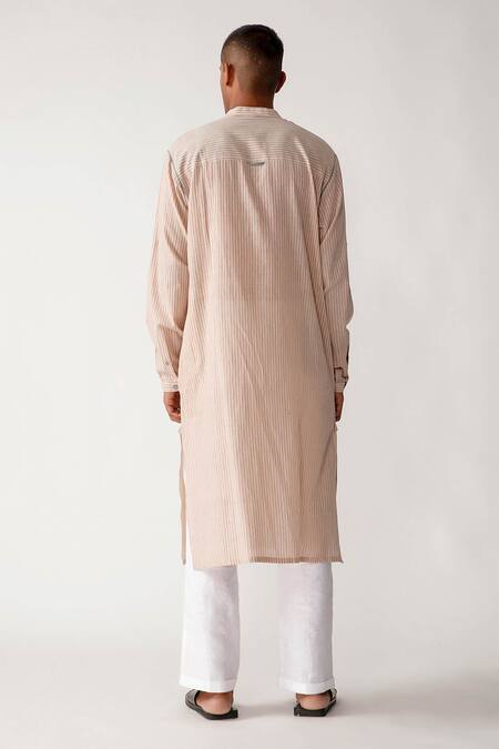 Beige straight long kurta with striped detail, 4-button placket, cuff sleeves & hand made detachable pea- buttons. Comes with ivory pants.