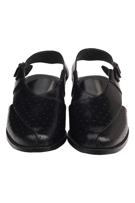 Black overlap handmade peshwaris with perforated texture, almond toe & adjustable ankle-buckle strap.