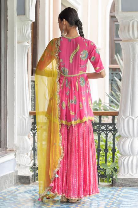 Bright pink floral bloom printed crepe short kurta with hand embroidered hemline and intricate bead work neckline . Paired with bright pink printed gharara with gotta detail and lime yellow hand embroidered dupatta.