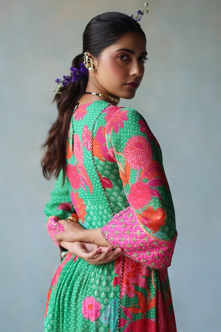 Green and hot pink floral bloom print Anarkali featuring intricate embroidery on the yoke and cuffs. Paired with a hot pink modal palazzo and a green organza dupatta with dori work and tassel detailing.