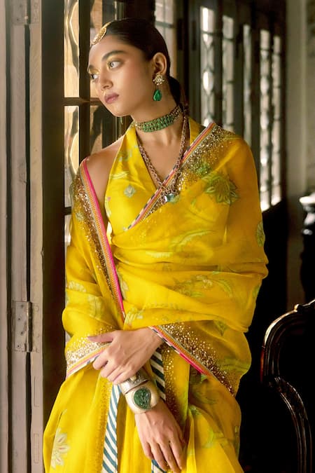 Lime Yellow floral bloom printed silk organza saree with intricate sequin and bead hand embroidery on border with fringe detailing on pallu. Paired with printed lime yellow silk unstitched blouse piece.