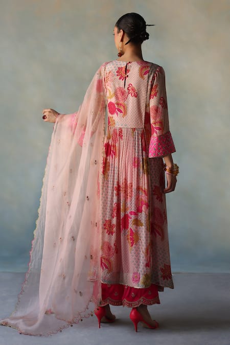 Pink flower vine print Anarkali featuring a round neckline and three quarter sleeves. Paired with a hot pink pant and an organza dupatta adorned with tassel detailing and scallop trim.
