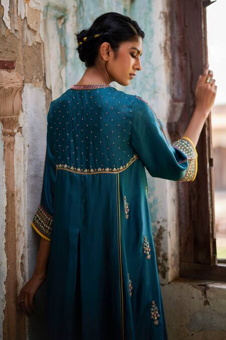 Blue Organza, Modal, Silk, Satin Embroidery, Nadira Floral Yoke Kurta Set
