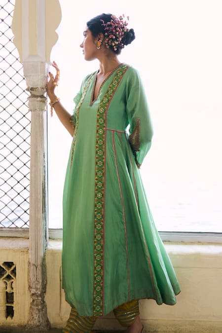 Green Silk Placement Hand Embroidery Cutdana V Neck Anarkali Salwar Set