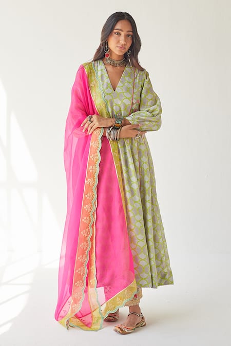 Buy_Rajiramniq_Grey Cotton Silk, Kota, Modal Thread Work, Shell Print V Puff Sleeve Kurta Set _Online_at_Aza_Fashions