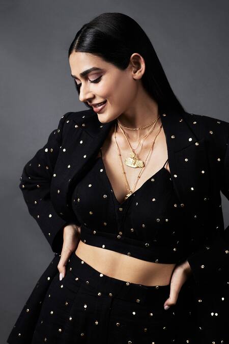Black blazer featuring gold badla placement embroidery, paired with a padded sweetheart neck bralette and matching pants. The set includes an attached lining for comfort.