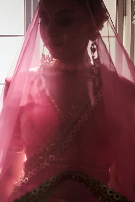 Pink Organza, Georgette Gota Patti Plunge Checkered Embroidered Lehenga Set