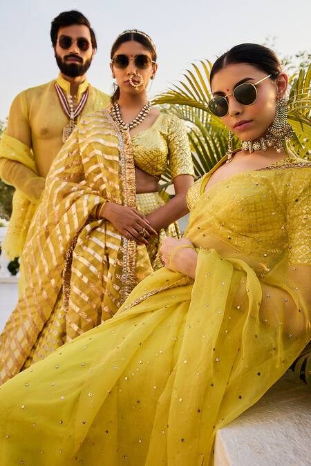 Lime yellow jacket featuring gota embroidered floral jaal patterns. Paired with an inner sheer kurta and stripe pattern pant.