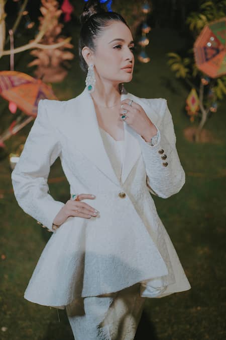 Asymmetric hemline on the blazer, All-over floral hand embroidery details, Attached lining for added comfort
