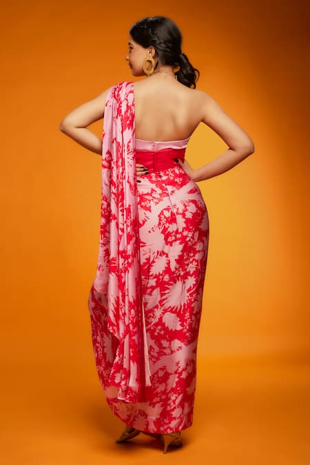Pink suzani pre-draped saree featuring all-over red abstract floral prints. Paired with a pink tube blouse and red corset belt.