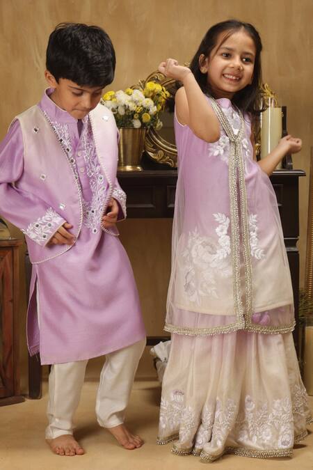 Purple kurta featuring intricate embroidery and a layered design. Paired with a matching lehenga and a net jacket adorned with embellishments.