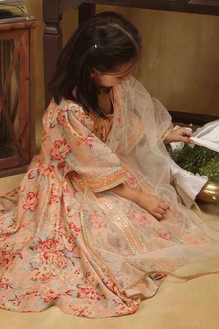 Buy_Rang By Les Petits_Peach Cotton, Net Sequins, Embroidery Floral Anarkali Sharara Set