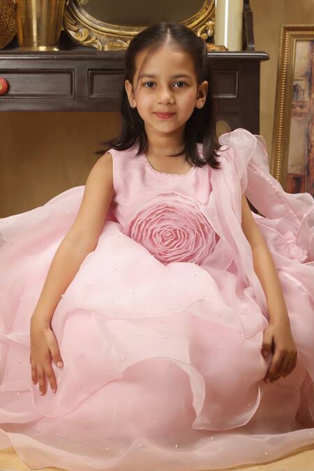 Pink lehenga set featuring a ruffle design with a rose embellishment on the blouse. Includes a coordinating net dupatta that enhances the overall look.