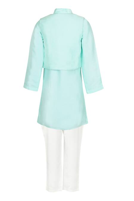 Blue bundi featuring jharoka embroidery with a band collar. Paired with a matching kurta and pant for a complete look.