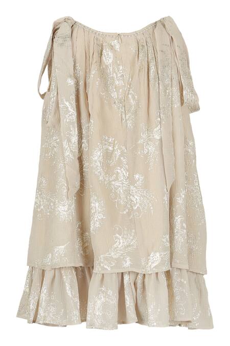 Beige satin dress featuring foil print all over with tie-up detailing on the shoulder