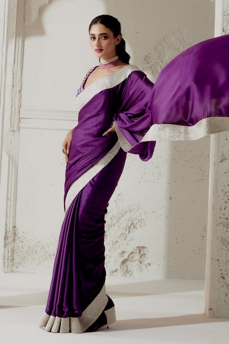 Purple silk satin saree featuring woven gota edging. Paired with a hand embroidered blouse with a plunging neckline.