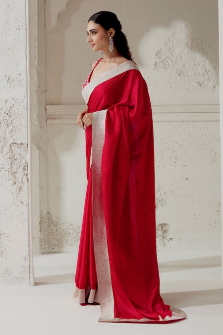 Red silk satin saree featuring woven gota edging. Paired with a hand embroidered blouse with a plunging neckline.