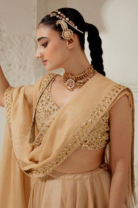 Gold flared lehenga made from blended silk featuring zardosi embroidery. It comes with a sleeveless embroidered blouse and a matching dupatta.