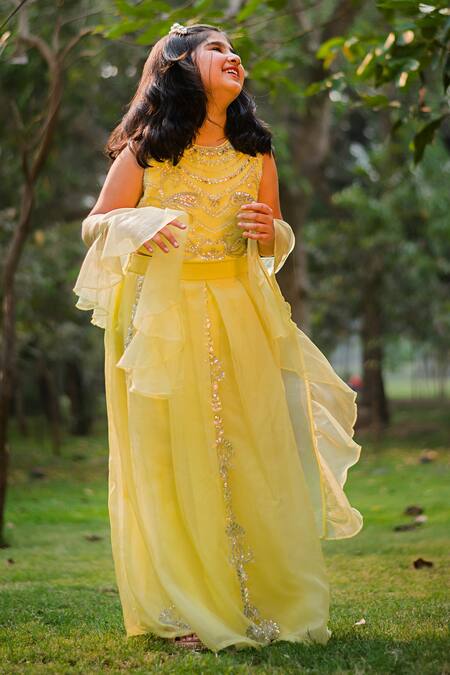 Yellow Organza Embroidered Crystal Pleated Lehenga Set