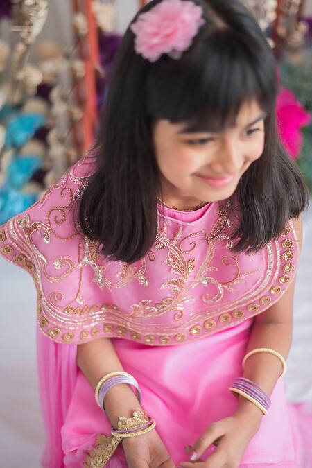 Pink kurta set featuring an asymmetric cut cape with all-over jaal pattern. Paired with a sleeveless kurta and flared gharara, adorned with dual-toned beads, sequin, and cut dana embroidery.