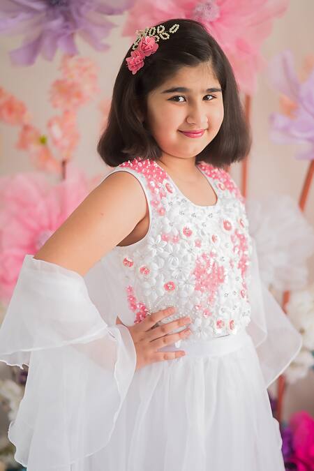 White organza top featuring all over peach and white toned 3D floral applique, pearls, sequin & beads embroidery. Paired with a flared lehenga and ruffle dupatta.