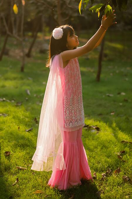 Pink kurta featuring all over pearl embroidered floral motifs with a round neckline and sleeveless design. Paired with a matching sharara and dupatta.