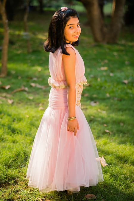 Pink lehenga featuring resham embroidered floral motifs on a broad waistband. Paired with a matching sleeveless peplum blouse with a round neckline.
