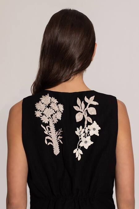 Black waistcoat crafted from viscose linen featuring intricate floral embroidery.