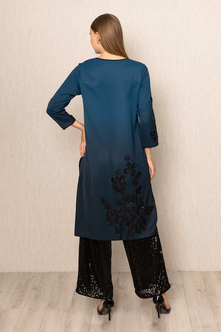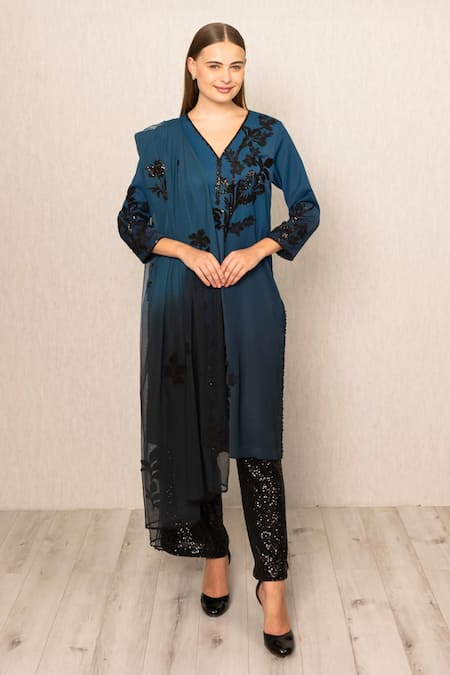 A teal blue ombre China Poly tunic featuring tonal black threadwork and sequin floral motifs. Paired with a sheer dupatta.