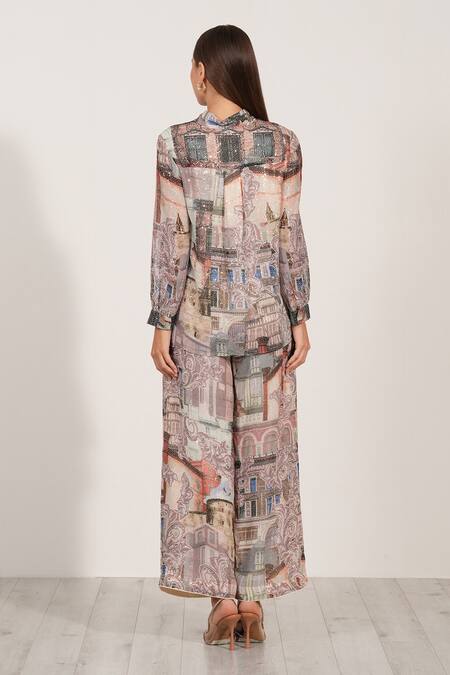 Buy_RANNA GILL_Beige Viscose, Georgette Sequins Collared Allegra Pleated Top And Pant Set_Online_at_Aza_Fashions