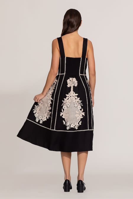Black Viscose, Linen Embroidery Square Neck Amara Midi Dress