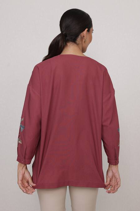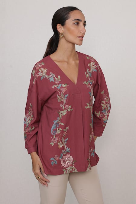 A rust red top in China Crinkle fabric features a V-neckline and box pleat.