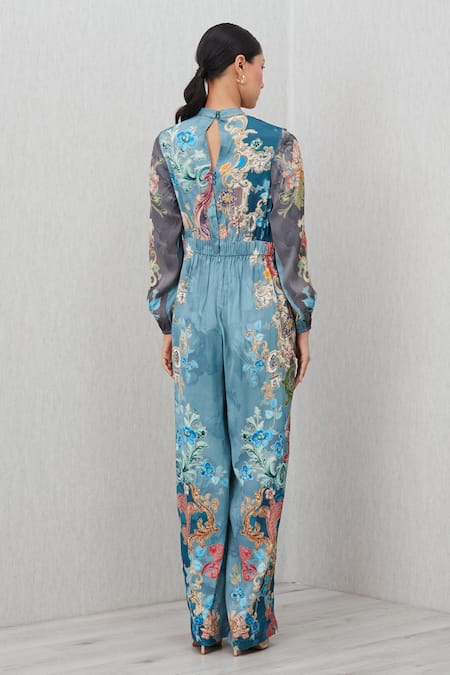 A multi-color Modal Satin jumpsuit featuring a wrap silhouette with a V-neckline and full sleeves.