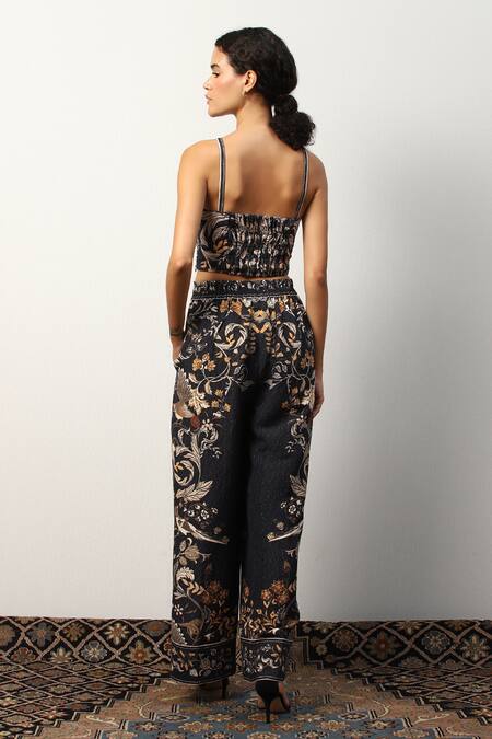 Black strap sleeves corset style top in linen viscose base with all over floral garden print.