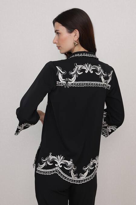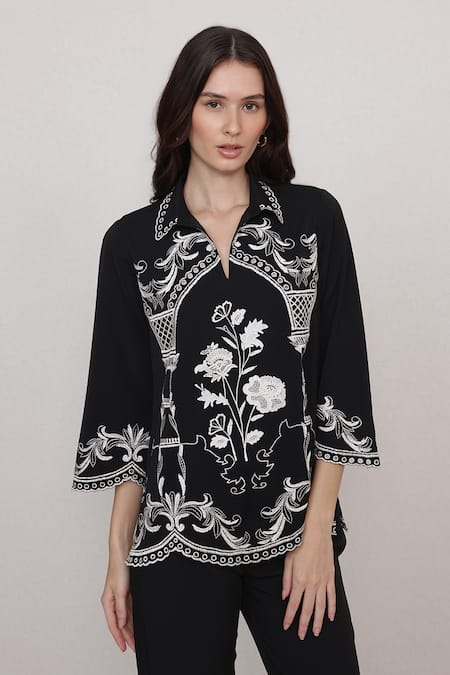 A black China Crepe top featuring white floral threadwork, intricate scallop borders, and angular detailing around the yoke.
