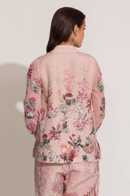 Cavern pink top featuring floral prints and a v-neckline. Paired with matching floral printed pants in viscose linen fabric.