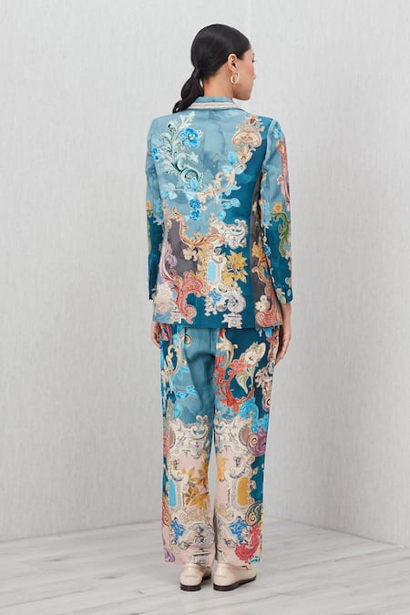 Baroque print with artful symmetry on shoulder and sleeve panels, Sharp notch lapels, Defined fit through the torso