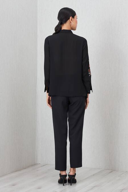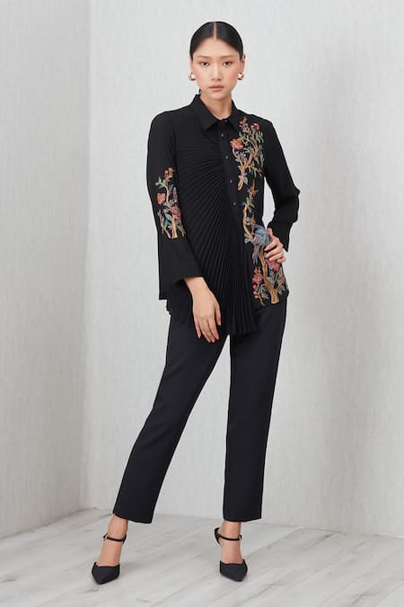 Black shirt with pleating and floral embroidery