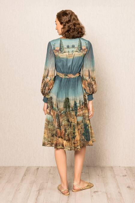 Teal blue pleated dress featuring a deep V-neckline and voluminous puff sleeves.