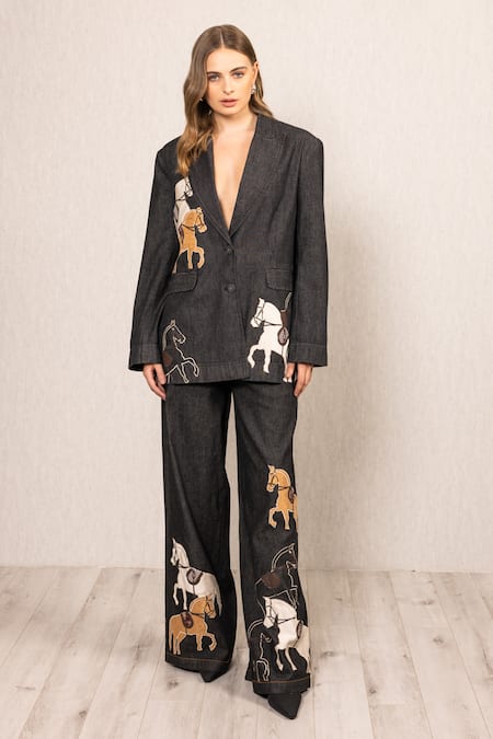 Black denim wide leg jeans featuring signature horse applique embroidery in contrasting hues.